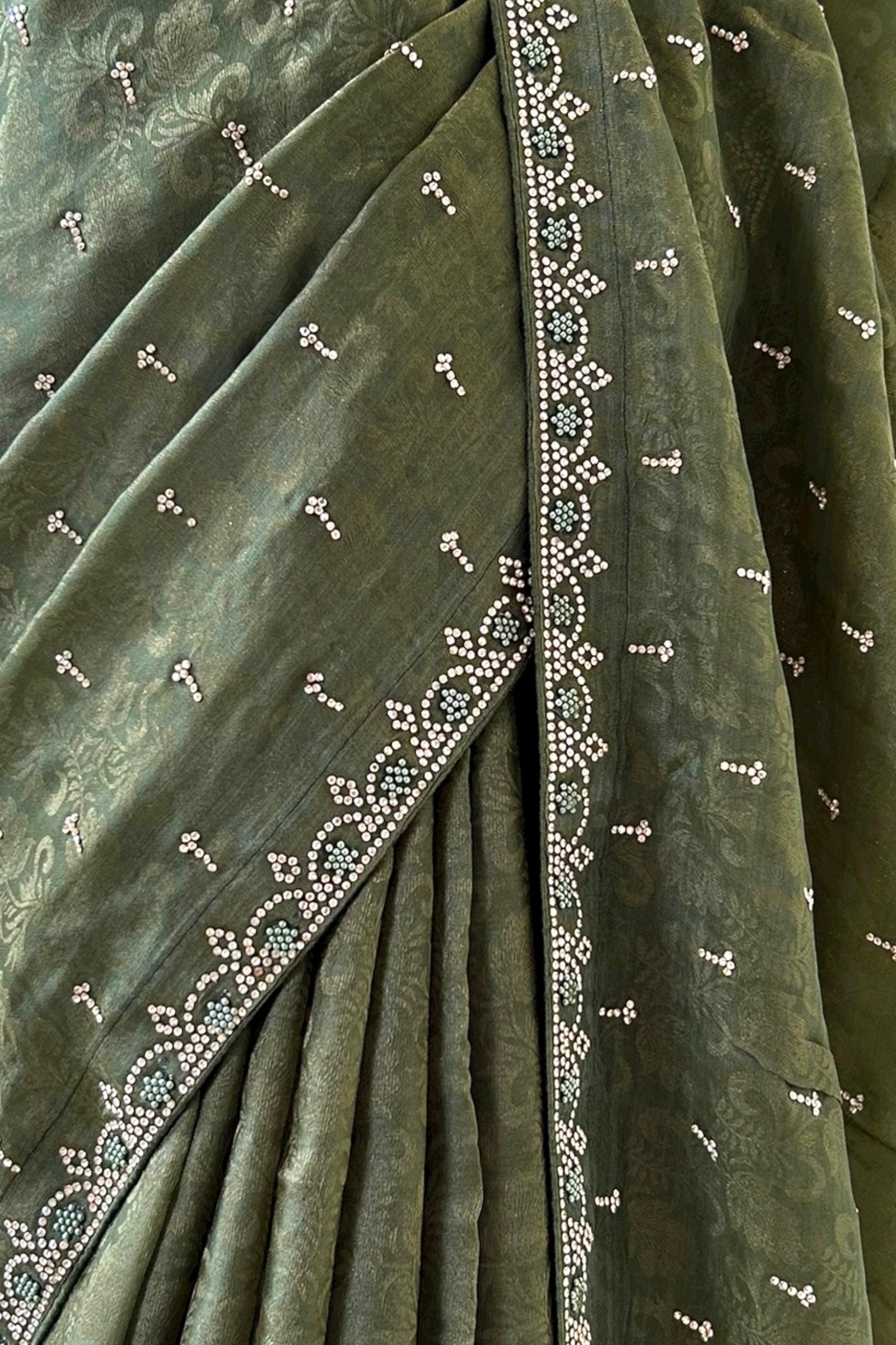 The saree features a self-woven texture that adds depth and dimension, while the delicate Swarovski embellishments shimmer beautifully with every movement. A finely detailed border enhances its royal appeal — making it ideal for wedding guests, festive galas, or high-end celebrations abroad.