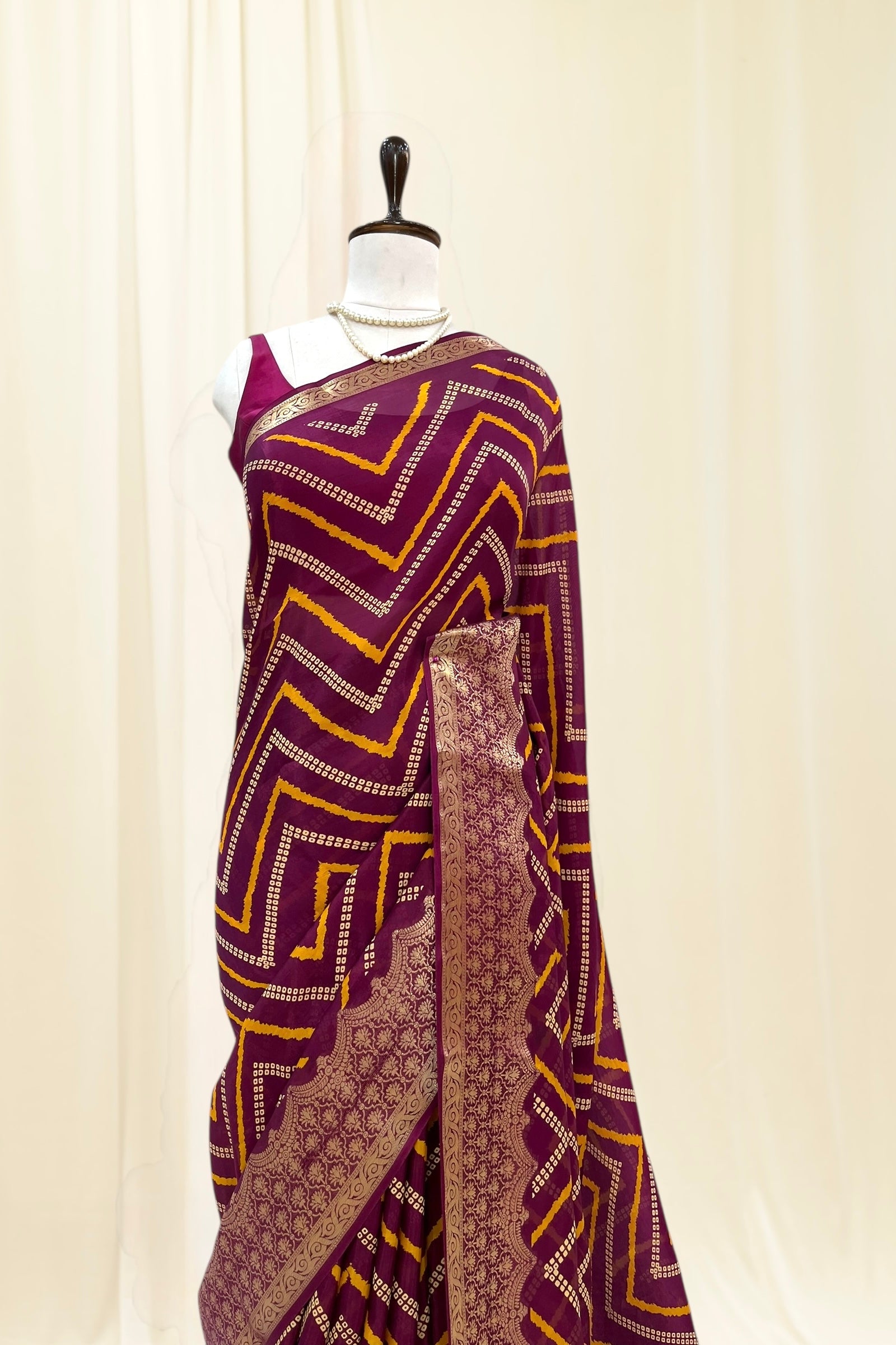 Fabric: Organza | Print: Leheriya | Border: Zari | Length: 5.5 m (approx.) + Blouse Piece Included | Care: Dry clean recommended / gentle hand wash cold